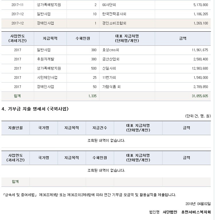 | » | 2017년 기부금모금액및 활용실적 명세서 | (사)휴먼서비스복지회 | 2018.04.03 | 26676 | |||