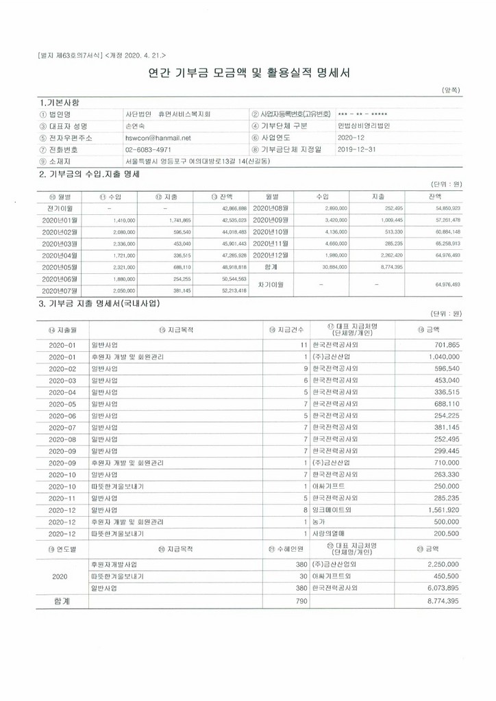 | 2020년 연간기부금 모금액 및 활용실적 명세서 | ||