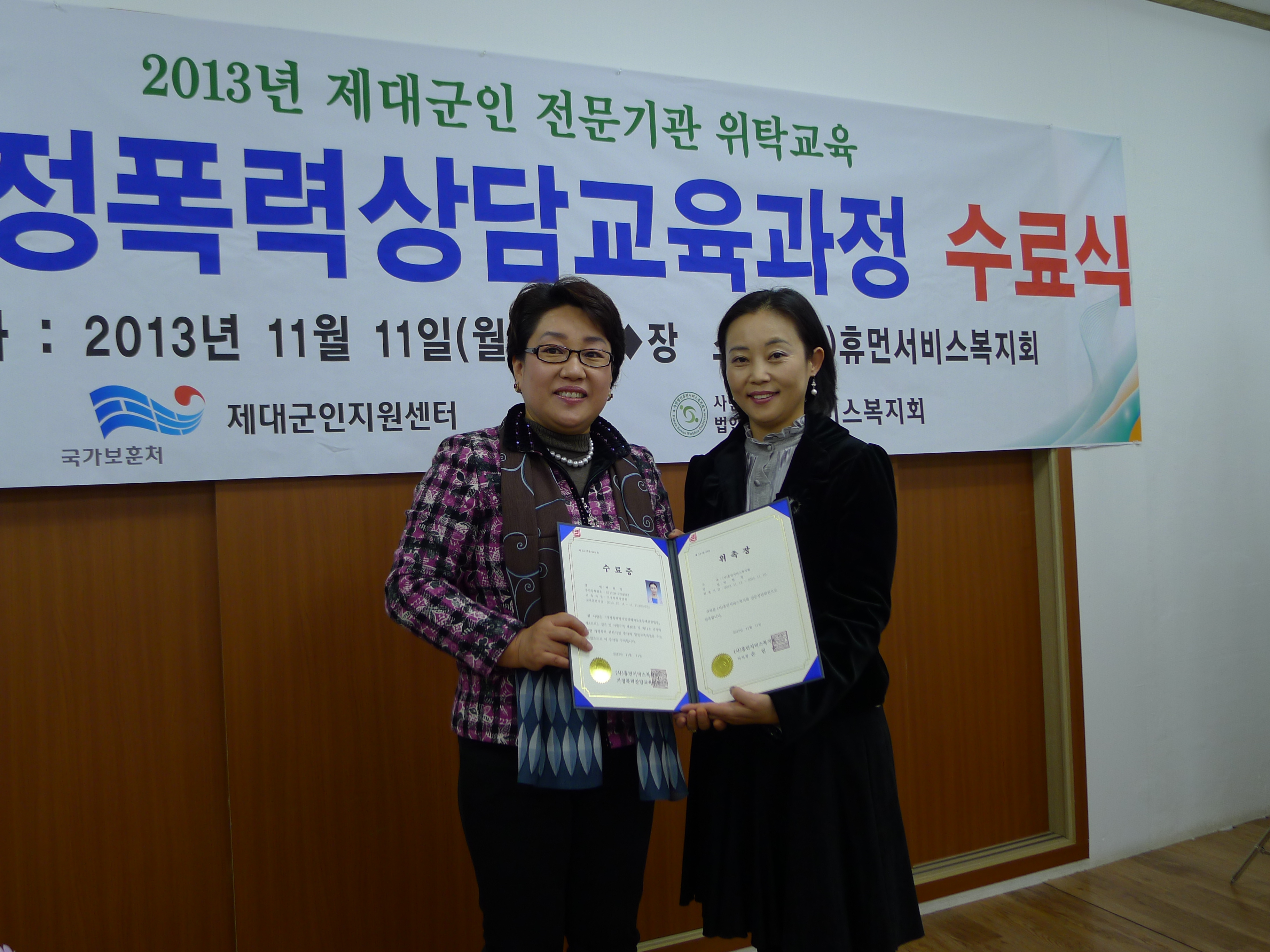 | » | ['13-3] 14기 [보훈처] 제대군인 성.가폭상담사 교육 수료식 | (사)휴먼서비스복지회 | 2013.11.11 | 4749 | |||