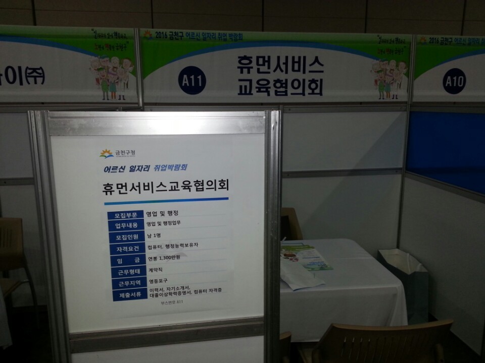 | » | 2016 금천구 어르신 일자리 취업박람회 참석 | 휴먼서비스교육협의회 | 2016.05.26 | 4247 | |||
